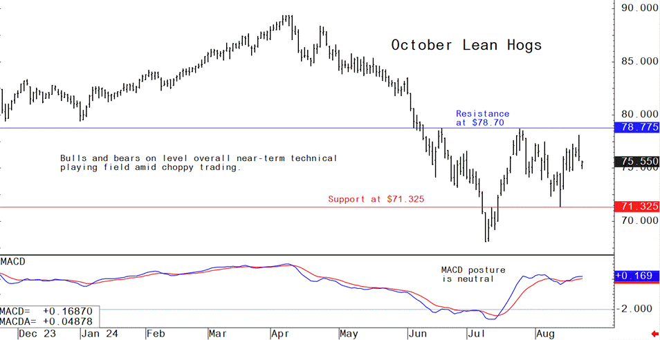 Livestock analyst Jim Wyckoff reports on global pig newsOctober lean hog futures Wednesday hit a nearly four-week high and then backed off. The near-term technical posture for the lean hog futures market is neutral, amid sideways and choppy trading. Look for more of the same in the near term. Fundamentally, wholesale pork prices are declining. The latest CME lean hog index dropped another 50 cents to $89.21, though is still 83 cents above the July low.