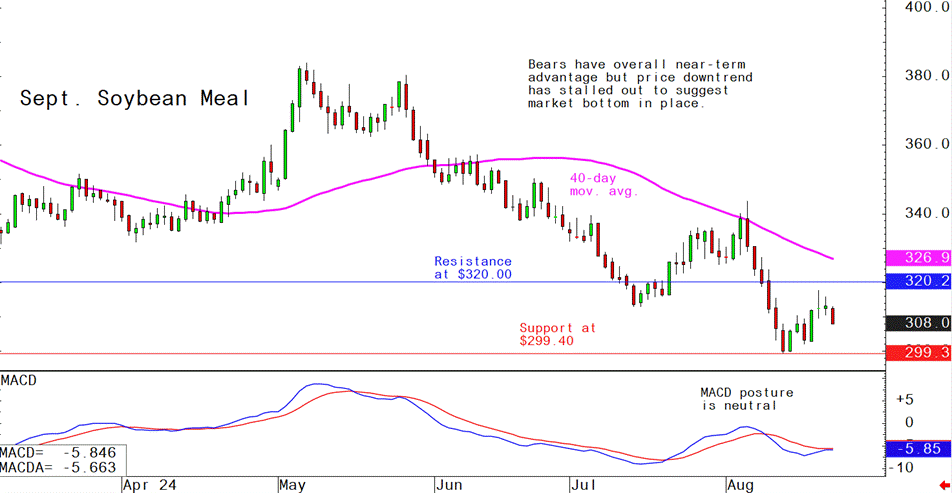 September soybean meal futures--$295.00 to $320.00, and with a sideways-lower bias