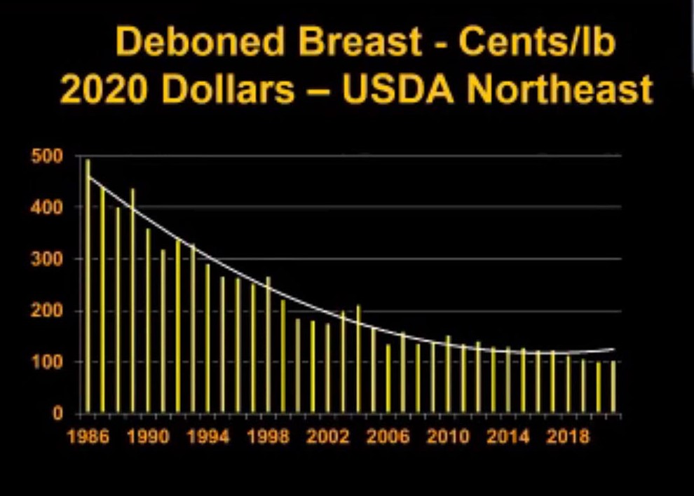 Deboned breast meat is a very important part of chicken production. Due to increased efficiency of production, deboned breasts have seen an 80% price drop since 1986, which was when the first dedicated processing plant for deboned breasts was opened.