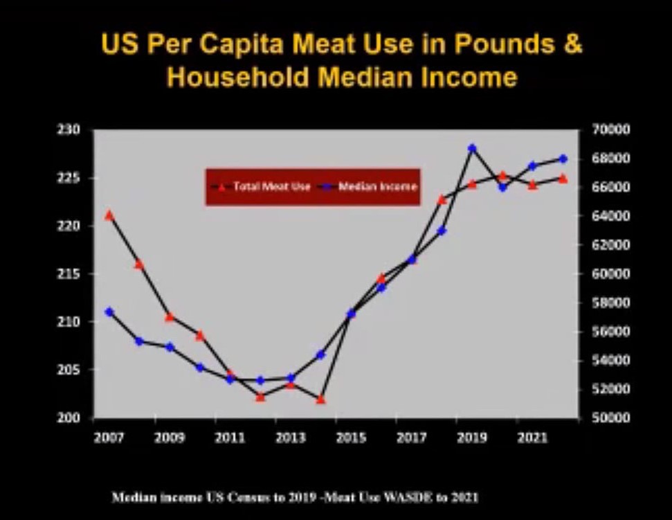 Aho followed median income and meat use from 2007 to 2022 and noticed a strong correlation between the two: