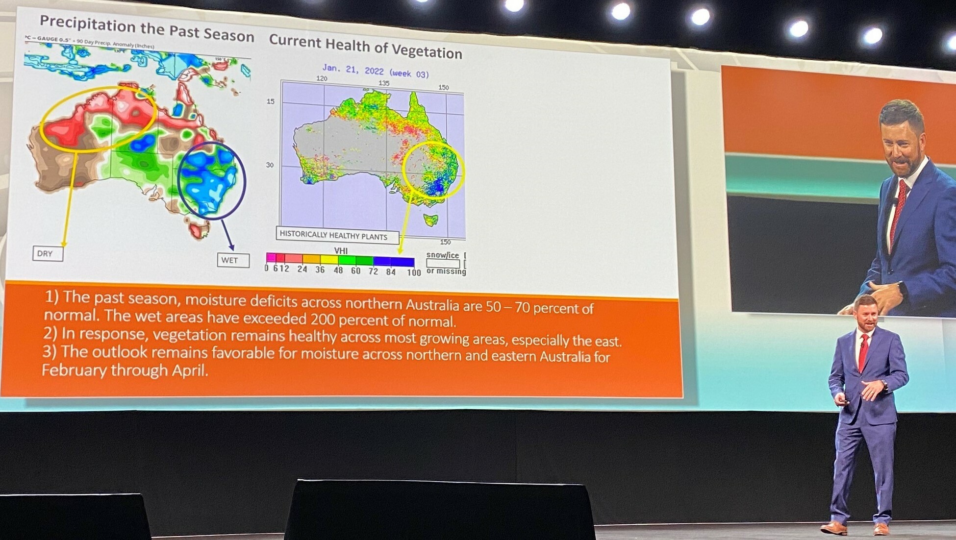 In Australia, the eastern side of the continent has had 200% of normal wetness, with the north seeing 50-75%, a major shift from a poor year in 2021.
