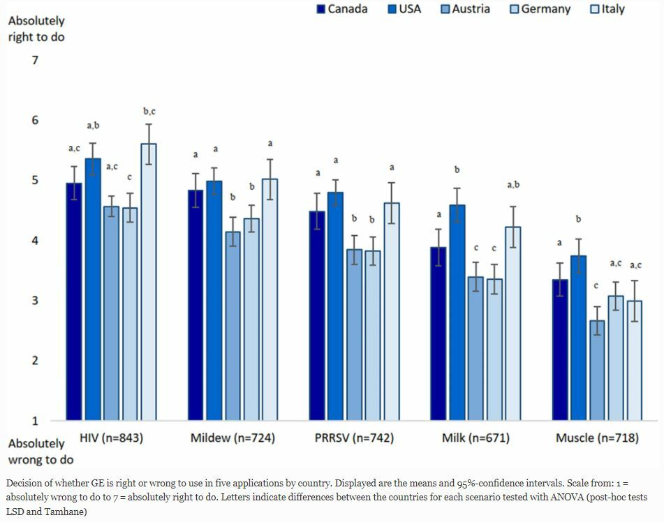 The results by country may surprise youA research team from the University of Göttingen and the University of British Columbia (Canada) has investigated how people in five different countries react to various usages of genome editing in agriculture. The researchers looked at which uses are accepted and how the risks and benefits of the new breeding technologies are rated by people. The results show only minor differences between the countries studied – Germany, Italy, Canada, Austria and the USA. In all countries, making changes to the genome is more likely to be deemed acceptable when used in crops rather than in livestock. The study was published in Agriculture and Human Values.