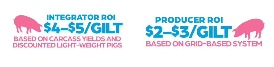 According to Zoetis’ ROI Simulator, IMPROVEST generates a net ROI for producers of $2–$3 per gilt when selling on a grid-based system and factoring in the improved percentage of heavier pigs marketed; and a net return for integrators of $4–$5 per gilt based on carcass and other product value and reduction in light/secondary marketed pigs.6