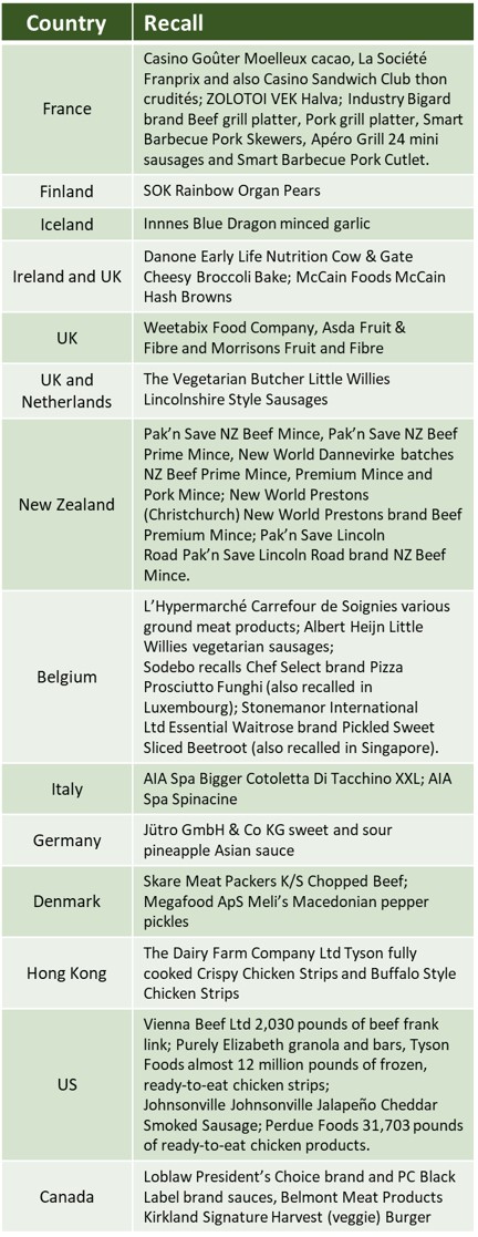 In May 2019 alone, there were recalls of at least 40 different food product across 16 countries (10 of them in Europe) due to foreign-matter contamination. Among the assorted debris, pieces of plastic, rubber, glass, bone, packaging and metal all made their way into a wide range of finished products that went out for consumer purchase. These products were mostly pork and other meat items, but also included vegetarian products, cacao, granola, pizza, pickles and much more (see below for the full list).