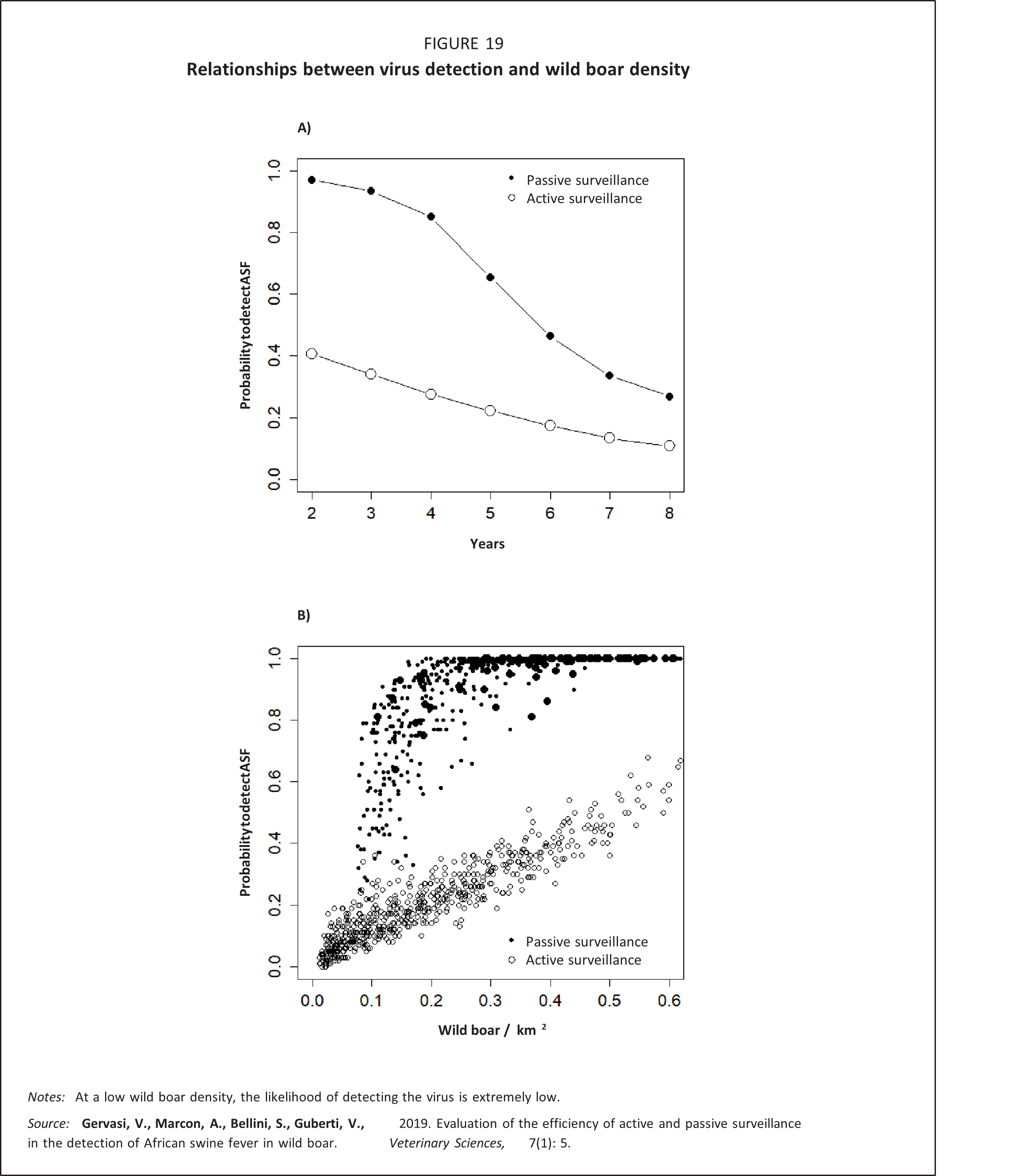 When prevalence drops below 1 percent and the population density of wild boar is very low (around 0.1–0.3 wild boar per km2), the usual sampling rates obtained through recreational hunting (about 40 percent of the post-reproductive wild boar population) cannot ensure sufficient statistical power to detect the virus. During this phase, active virological surveillance through hunting could provide the false impression that the disease has vanished spontaneously. However, evidence obtained in such epidemiological settings cannot prove there is no ASF, which should be demonstrated through a special strategy for the situation.
