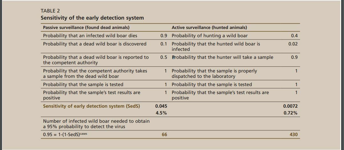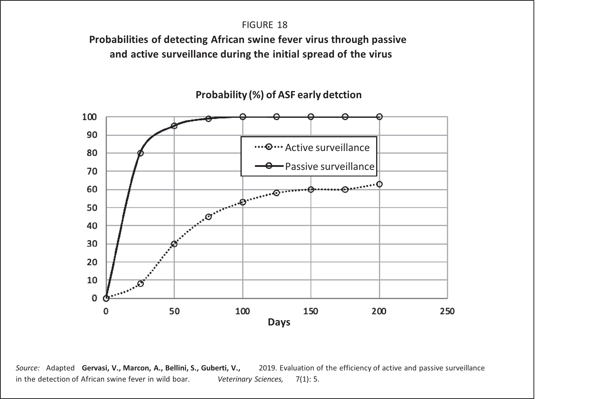 Table 2 shows that it is almost impossible to have a 100 percent efficient early detection (e.g. to immediately detect the very first wild boar that died from ASF). The virus is more likely to be detected when the epidemic has already produced a number of carcasses, which were missed or not reported. However, the calculations show that the best early detection strategy is to look for carcasses rather than trying to bag and test animals. The two weakest steps in passive surveillance (discovering and reporting) can be improved through active, well-planned and organized carcass searches coordinated by competent authorities, which can also ensure that maximum sampling and testing rates are achieved. Enhancing carcass searches and reporting is not an easy task. The terrain and weather, availability of personnel, awareness of the local population and logistical issues (such as transportation) limit active carcass searches. In high-risk areas, awareness campaigns should address the importance of reporting any dead animals to the competent authorities. Financial incentives, the use of specially trained dogs, the application of drones and thermal imaging and any other methods that increase the chances of discovering and testing carcasses with ASF improve the sensitivity of passive surveillance.