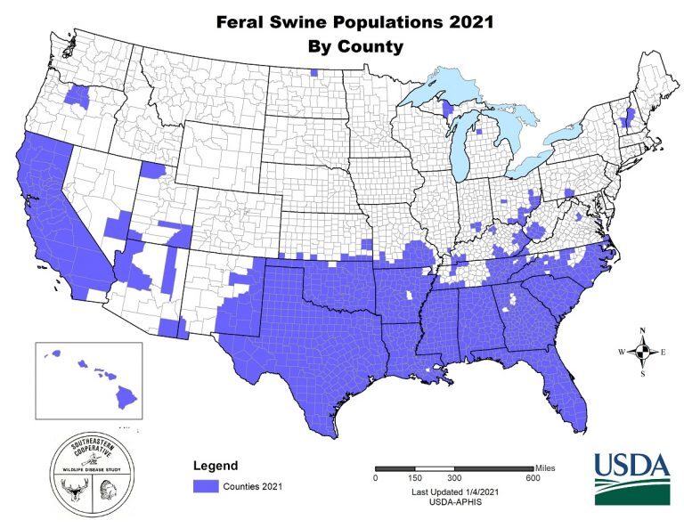 Mark Smith: Wild pigs are a non-native species in North America. Free-ranging populations of wild pigs can be found in about 35 states and southern portions of Canada. They are most prevalent in the southeastern United States and California, with smaller, localized populations in other states. Wild pigs can be found throughout most of Alabama, with the greatest abundance in the southern half of the state. In the more northern counties of Alabama, wild pigs occur in smaller localized pockets all the way up to the Tennessee border. The U.S. Department of Agriculture Animal and Plant Health Inspection Service has a good map showing wild pig locations across the U.S.