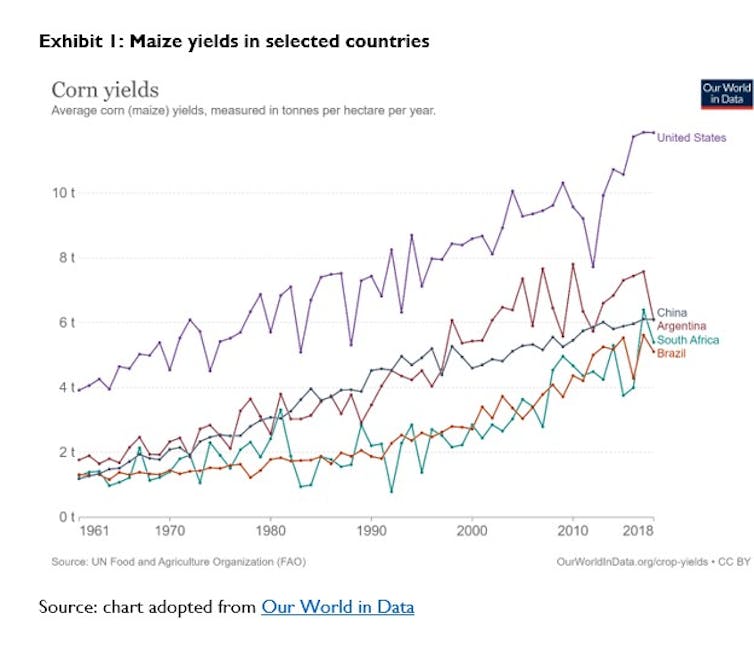 China’s maize yields are comparable with South Africa, the United States, Argentina and Brazil, which have long adopted the genetically modified seeds (see Exhibit 1).
