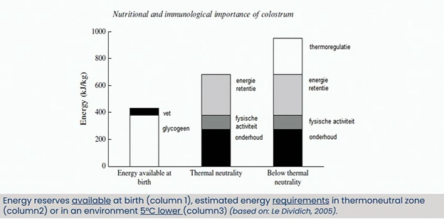 The chart above shows the energy that is available in the piglets at birth (left column) The middle column shows the energy needed for maintenance and for performance at thermo neutral conditions (optimal conditions). The right column shows what the energy requirements are for piglets that are housed below thermo neutrality, so it's too cold in the farrowing house.