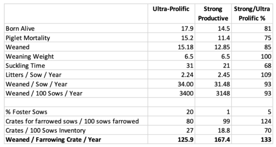 Looking at most metrics for “Ultra-prolific” sows most are better at a per sow level. However, there is a significant difference when it comes to looking at the effective use of the farm – the real limiting factor to profitability……. Strong productive sows able to wean large vigorous piglets at 21 days produce significantly more piglets per farrowing crate per year.