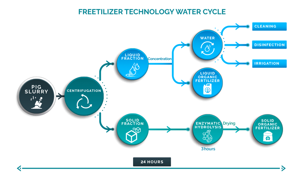 Freetilizer is an innovative technology with a pending patent, based on a hydrolysis process that applies specific enzymes in a reactor with controlled agitation, pH and temperature, that creates new value for organic waste transforming it into organic fertilizers in less than 24 hours. The application of a separation process combined with Freetilizer technology presents excellent results for the valorisation, or increasing the value, of pig slurry/manure and the reuse of wastewater.