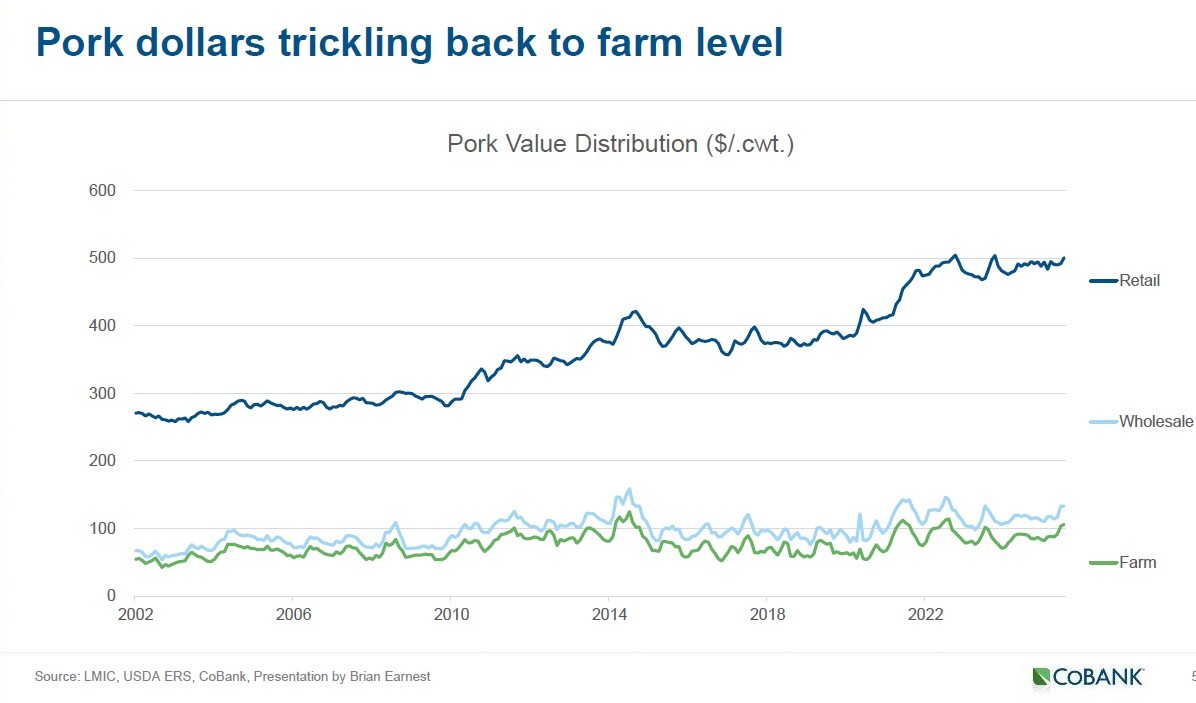 Still, not all revenue reaches the farm gate. Retail pork prices have risen from roughly $3 per pound in the early 2000s to $5 today, while the farm share of that value has declined. Earnest illustrated the widening gap between wholesale, retail and farm-level prices. Even as market hog values improve, he said, “Those pork dollars coming back to the farm level are not necessarily keeping pace with what the dollars are at retail.”