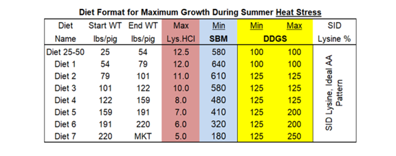 “Outside of the formulation process activity that needs to go on, will with added gain, turn us to a greater revenue capture situation. The chart above has minimum soybean meal content across diets, maximum levels of crystalline lysine being suggested and maximum levels of DDGs,” he said. “There's a minimum level of DDGs listed because of the gut health aspects that have been shown in some research relative to DDGs. So, as we begin to talk about formulation, we need to keep an open mind and look at it with a fresh outlook.”
