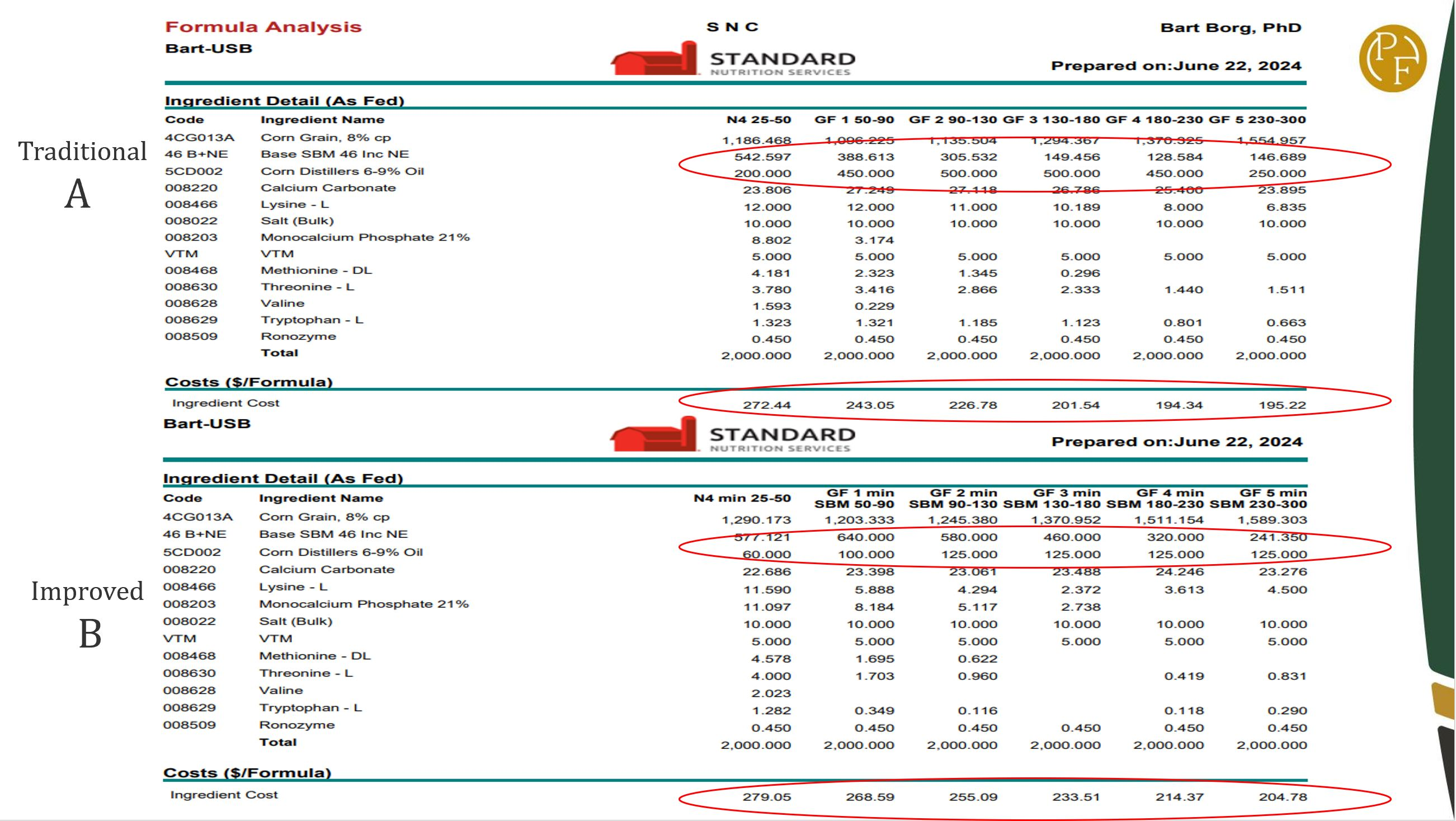 “There’s quite a difference in cost between the diets that are formulated to the same specifications. If you've got a producer who is focused on ingredient cost, remember that, as a nutritionist or advisor, you need to remind your producer that there's a revenue component to be considered in the final equation. In the end, the invoice price of the feed doesn't guarantee a positive revenue.”