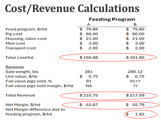 “If you stop there and just look at feed, you'd say go with program A, but you haven't considered total revenue,” he said. “By adding up the other costs, program A ends up costing $156.88, while program B costs $161.80. If we add revenue in and consider what could be a weight change difference, there’s an opportunity to get additional revenue. For total revenue, we have $210.75 for the traditional program A and $217.59 for program B, the ‘improved’ program. The net margin shows a $1.92 per pig advantage for program B, primarily due to the additional revenue gained in weight.”