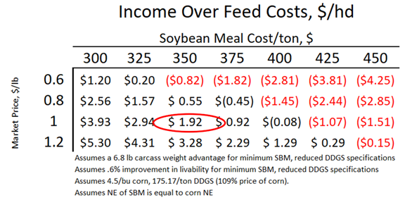 By setting up a sensitivity table, you can identify different iterations of the model that work and others that don’t work because at some point the value of the soybean meal weight advantage isn't going to overcome a cost of diet difference and that needs to be considered.