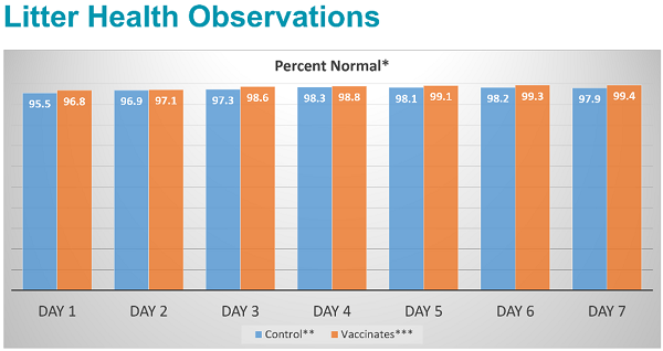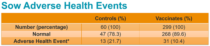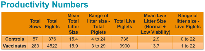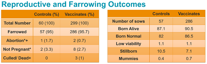 No clinical or biologically relevant differences between the vaccinated groups and the control groups were observed in terms of reproductive outcomes, farrowing outcomes, adverse events or productivity. More than 90% of piglets per litter were normal for each group on each day observed.
