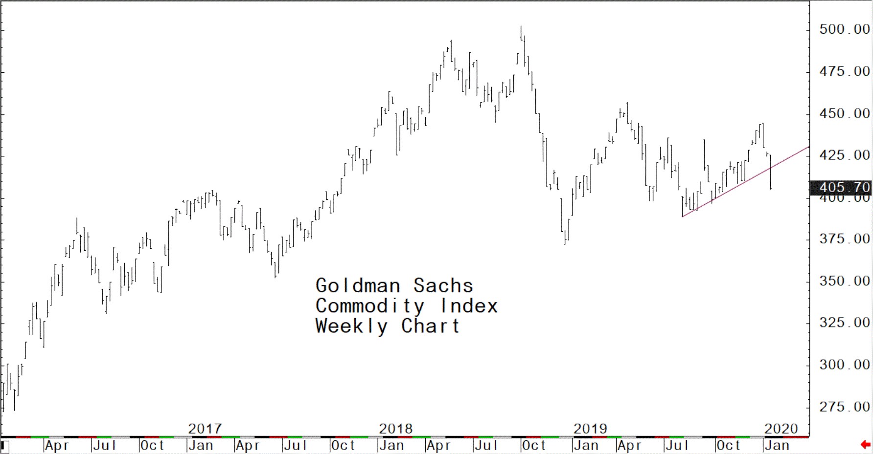 The Goldman Sachs Commodity Index (GSCI) is comprised of several raw commodity futures market prices rolled into one index price. The weekly GSCI chart shows a price uptrend that was in place since last August has now been soundly negated. This has dented bullish enthusiasm in the raw commodity sector. Importantly, the speculative traders, including the big “fund” players, are now going to be much less likely to play the long side of the raw commodity markets - at least for the near term. And it’s the speculators that tend to add the fuel to price uptrends on the charts that turn into big bull market runs, including in ag futures markets.