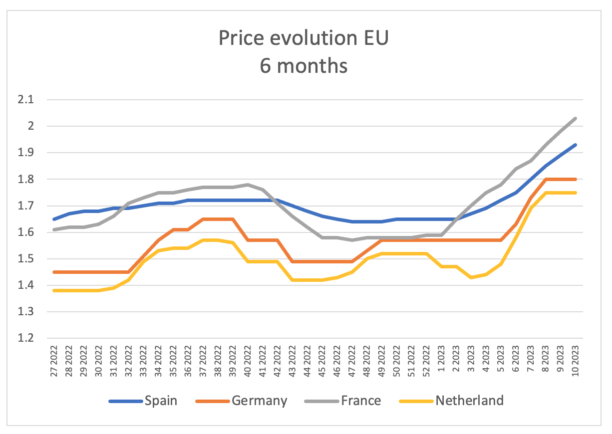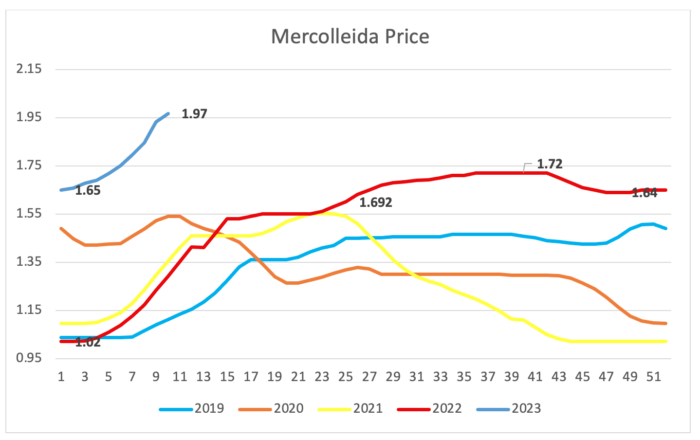 At the beginning of the year, looking at how our market was going, we observe that the prices were rising, but the truth is that we did not think that it could reach 2 € and here we are. In this week’s market, the price closed at 1.97€/kg live weight and we assume that this limit will be surpassed, a barrier that we would have considered impossible a year ago. This is due to the sharp decline in supply throughout the EU.