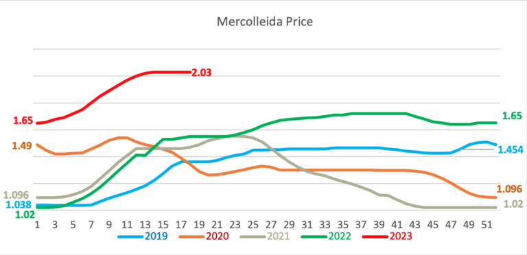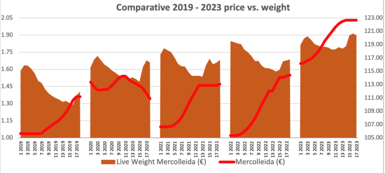 - The price in Spain broke records until April, when it reached a value that a few months ago we would have said was impossible, and it has been repeating for 5 weeks now at 2.03€/kg live weight.