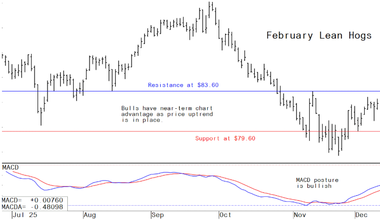 Lean hog futures prices are trending up and bulls have the advantage. February lean hogs on Wednesday rose 55 cents to $82.425. Hog futures saw some modest technical buying as the near-term chart posture for the market has turned bullish. Hog traders are also reckoning the cash hog market has put in a seasonal bottom, which is keeping a floor under futures prices. The latest CME lean hog index is up 5 cents to $81.89. Thursday’s projected cash index price is up 27 cents at $82.16.