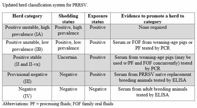 - Dr. Derald Holtkamp, DVM, professor at ISU, provided an update of the new AASV classification system that was recently published in the Journal of Swine Health and Production (JSCHAP). The new AASV classification system incorporates serum or family oral fluids from weaning-age pig or processing fluids tested by PCR and Category I was divided into two categories. Also, a vaccinated sub-category for Category II was added that incorporates II-VX, which is PRRS-positive stable vaccinated.