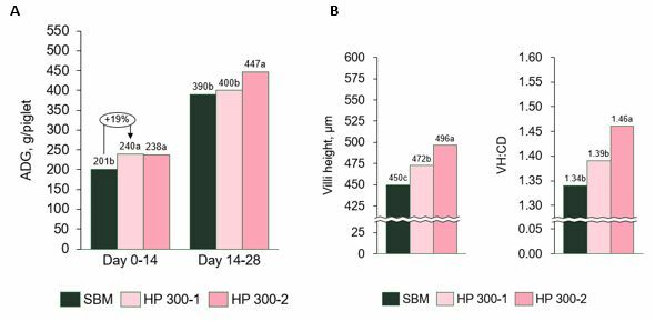 It is well known that growth performance and intestinal health of piglets is impaired when fed diets with high amounts of anti-nutritional factors. Our studies show that replacing all or part of SBM by HP 300 (an enzyme-treated soybean meal with a reduced content of soy ANF’s) improves piglet growth (figure 1a) and feed efficiency throughout the nursery phase while reducing scouring. In addition, replacing SBM by HP 300 in nursery diets, improved oxidative status and reduced damage to the intestinal villi (figure 1b) and increased the expression of tight junction proteins (Ma et al., 2019 a; b).