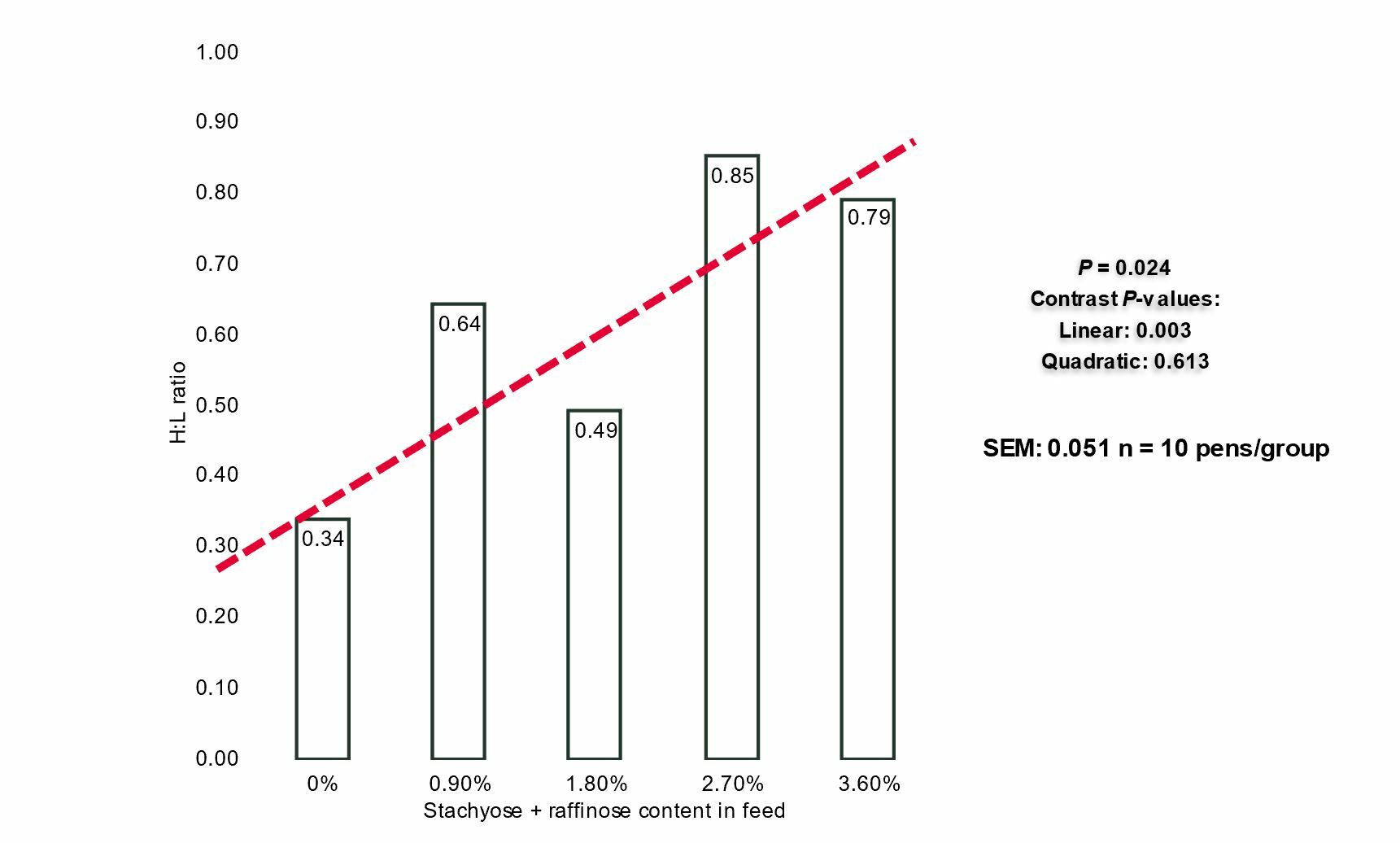 Similarly, recent studies by the University of Arkansas Poultry Science Department (Teague et al., 2021) have shown that stachyose and raffinose, indigestible oligosaccharides in soybean meal, exert a dose-dependent inflammatory effect not only in the gut of starter chicks but also at the systemic level. Thus, these authors observed that tight junction permeability in intestinal epithelium increased quadratically in 14d-old chicks as dietary stachyose and raffinose increased, with the greatest permeability observed at 1.8% dietary level. Increased tight junction permeability will result in increased secretory passage of ions and water causing leak flux diarrhea (gut leakage). Thus, in the same study, there was a linear increase in excreta moisture as dietary soy oligosaccharides increased. Furthermore, leaky gut leads to translocation of gut bacteria, microbial compounds, and/or antigens generating a systemic immune response, Therefore, beyond the intestine, a linear increase in whole blood heterophil-to-lymphocyte ratio (H:L-ratio) was observed as dietary stachyose and raffinose increased (Figure 2). The H:L-ratio is generally considered a reliable and robust indicator of stress in poultry. This parameter allows, in a simple way, to evaluate activity of the immune system and health state of birds.
