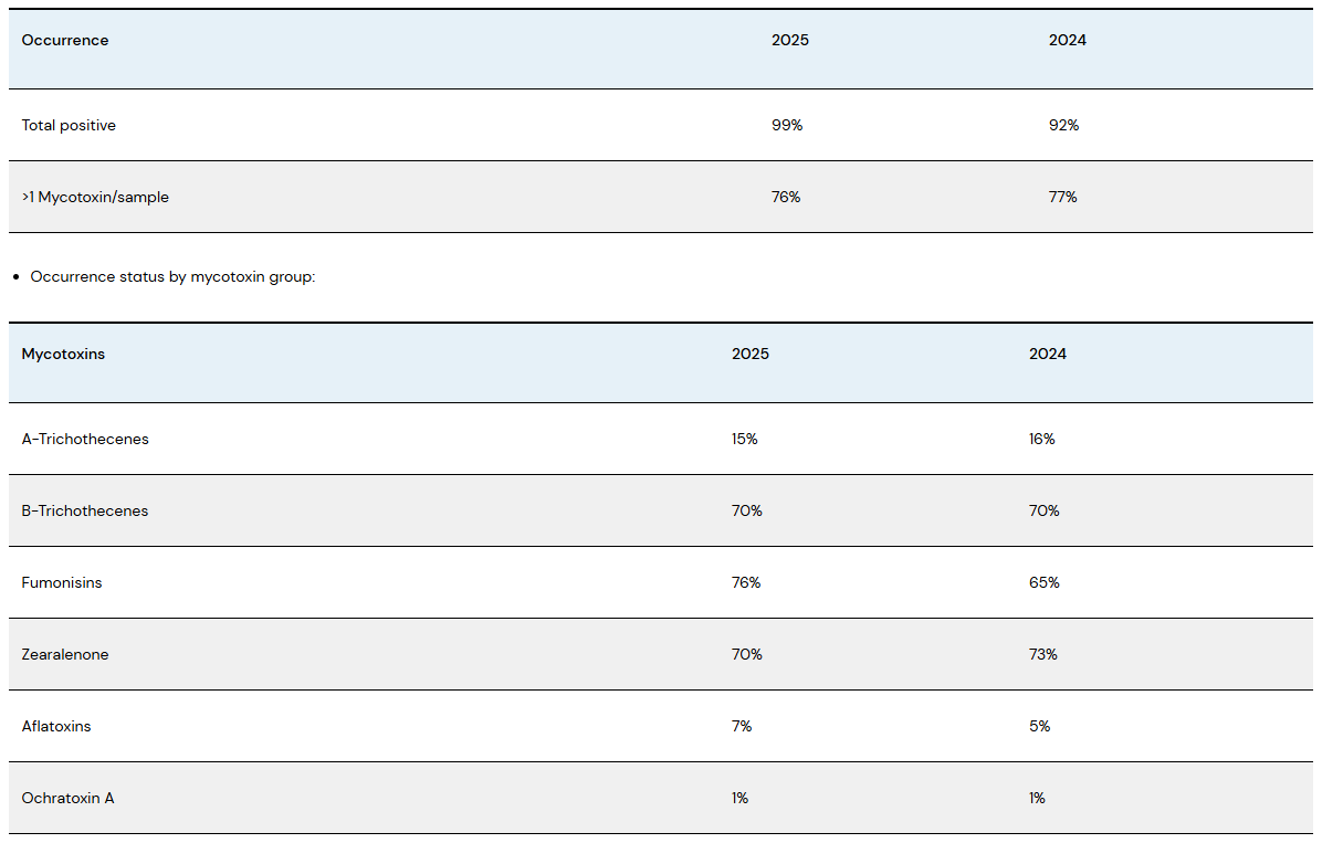 - Based on the 242 corn grain samples tested to date, surveillance of 2025 crop suggests an increase in the occurrence of Fumonisins (+11% points) while Aflatoxins (+2% points), B-Trichothecenes (no change), A-Trichothecenes (-1% point), and Zearalenone (-3% points) are similar vs. 2024 crop year results.