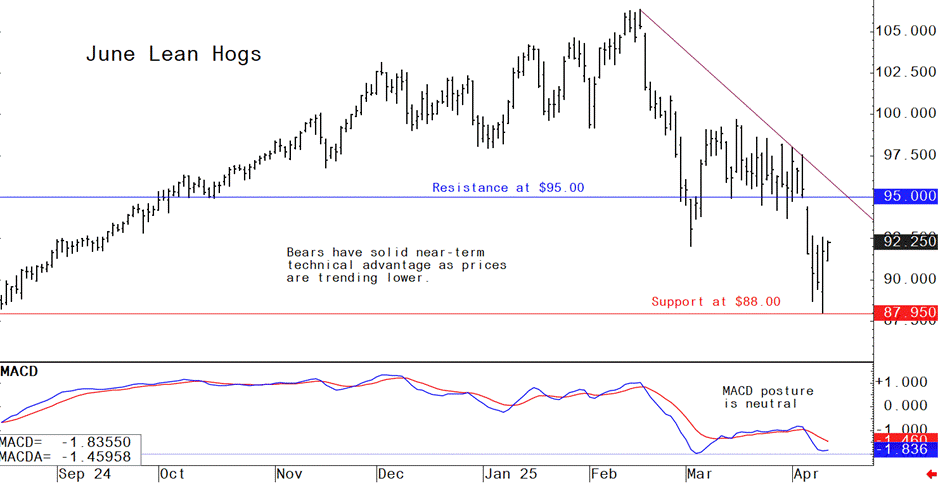 Livestock analyst Jim Wyckoff reports on global newsJune lean hog futures prices this week hit an eight-month low. Bears have the solid near-term technical advantage amid a price downtrend in place on the daily bar chart. Recent weakness in pork cutout value has traders concerned recent downside price action in the CME lean hog index will continue. The latest index is down 16 cents to $88.00 as of April 8. Reports U.S. tariffs will be suspended on all countries but China, who will be tariffed at 125%, effectively immediately. Once that news hit the wires, lean hog futures surged. Trading in hog futures is likely to remain volatile as tariff headlines continue to drive daily price action. The escalating trade war with China is likely to weigh on trade in hog futures.