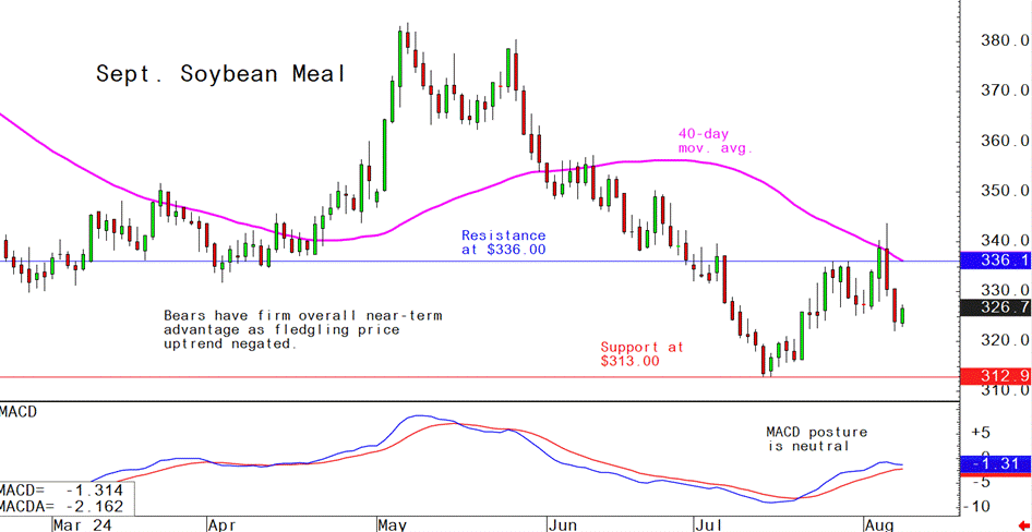 September soybean meal futures--$313.00 to $343.70, and with a sideways-lower bias