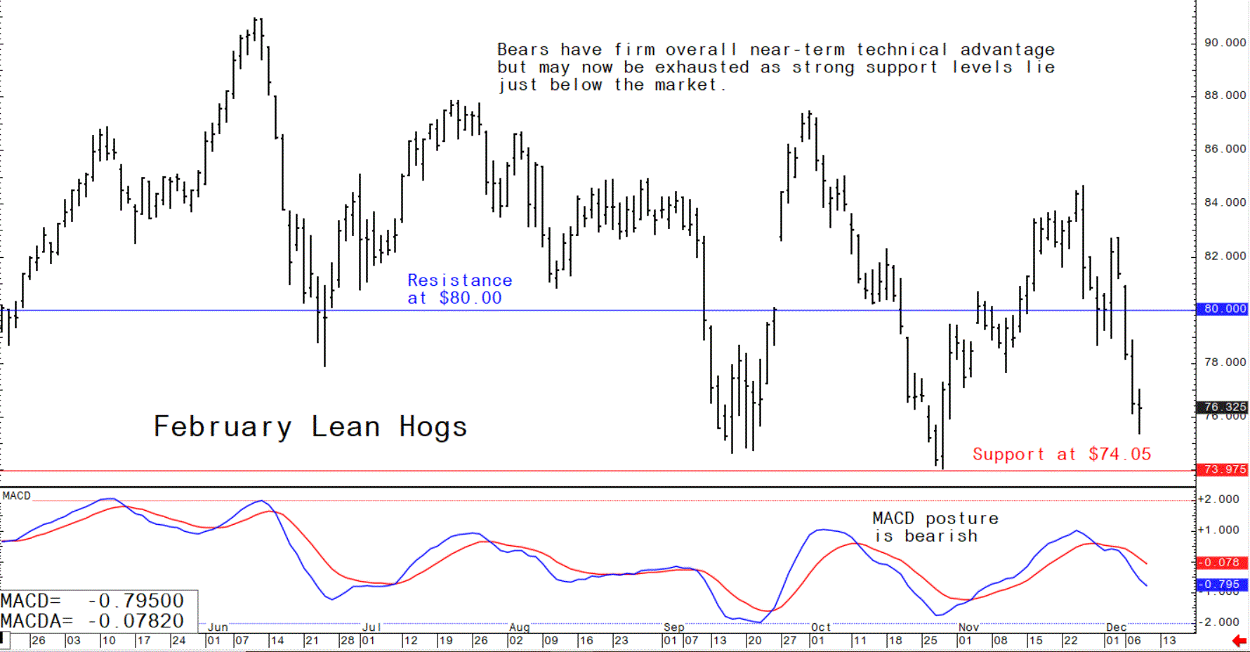 After recent strong selling pressure the lean hog futures bears may have run out of gas. Price gains to end this week would confirm such and also suggest a market bottom is in place. The pork cutout value on Wednesday gained an impressive $9.35, boosted by a $29.58 rise in hams. Also impressive is packers moved 412.90 loads of product at the sharply higher prices Wednesday. The cash hog and pork product markets are signaling lows may be in place. US hog supplies typically peak in mid-December, then begin a seasonal decline into early summer.