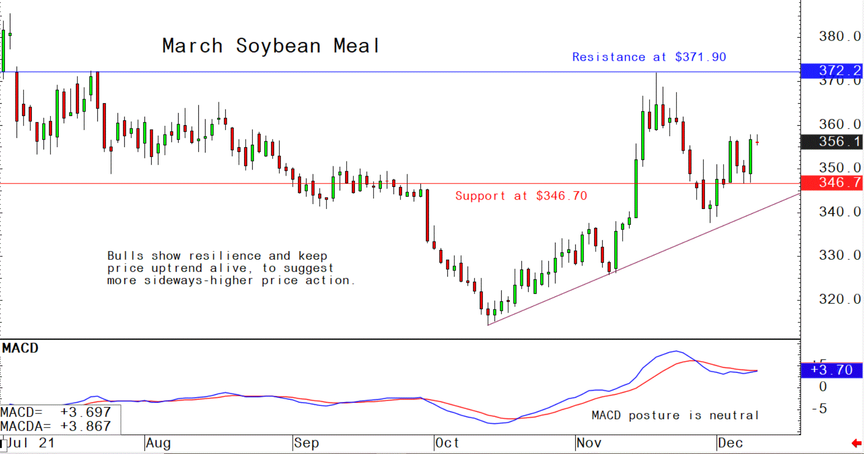 March soybean meal futures--$345.00 to $365.00, and with a sideways-higher bias
