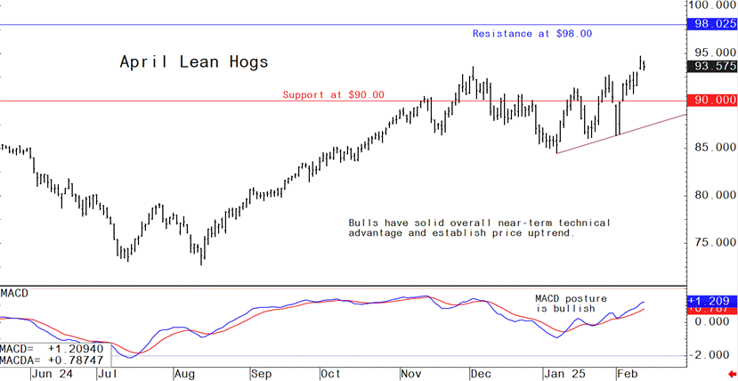 April lean hog futures--$91.00 to $98.00 and with a sideways-higher bias
