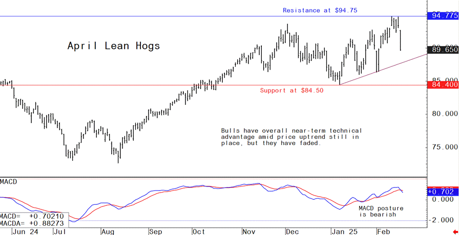 Livestock analyst Jim Wyckoff reports on global pig marketsApril lean hog futures on Wednesday saw strong selling pressure, much of which was profit taking. However, recent history shows that hog market bulls are resilient, so they can’t be counted out regarding another strong price recovery in the near term. Fundamentally, pork cutout value on Wednesday fell another $3.95 to 495.52, led lower by a $16.75 drop bellies. Over the past two days, the cutout has dropped $6.95 due to a $27.00 drop in belly prices. Weakness in pork cutout value has led to concerns the recent seasonal rally in hogs could be stalling out. The latest CME lean hog index continues to strengthen, however, rising another 79 cents to $90.98 as of Feb. 18.