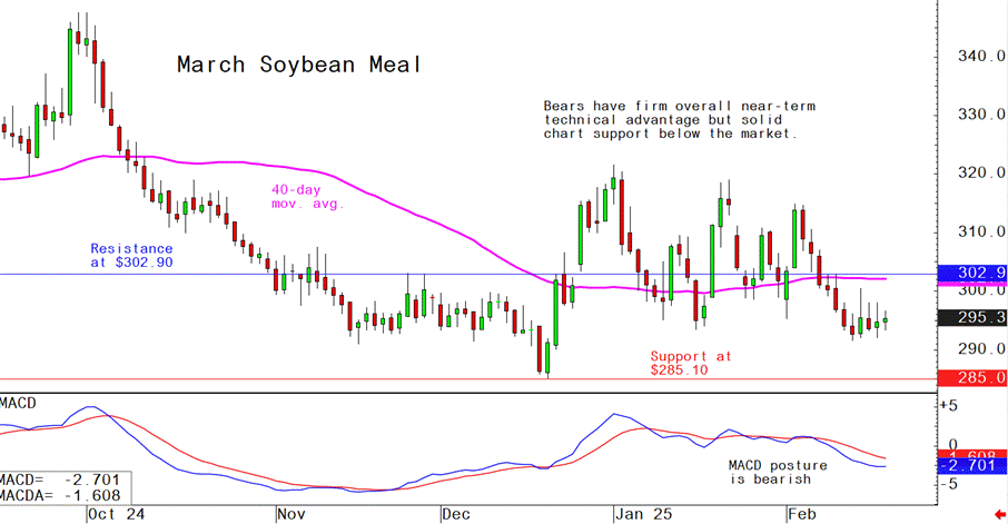 March soybean meal futures--$290.00 to $305.00, and with a sideways-higher bias
