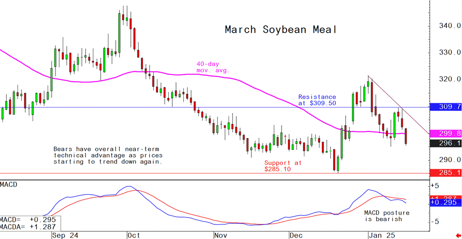 March soybean meal futures--$285.10 to $310.00, and with a sideways bias