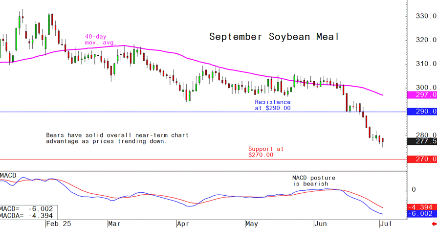 September soybean meal futures--$265.00 to $285.00, and with a sideways bias