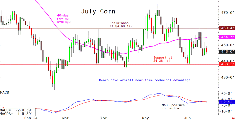 July corn futures--$4.38 1/4 to $4.60 1/2 and a sideways-lower bias