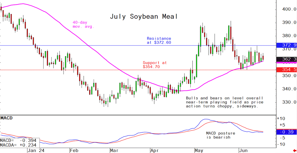 July soybean meal futures--$354.70 to $375.00, and with a sideways bias