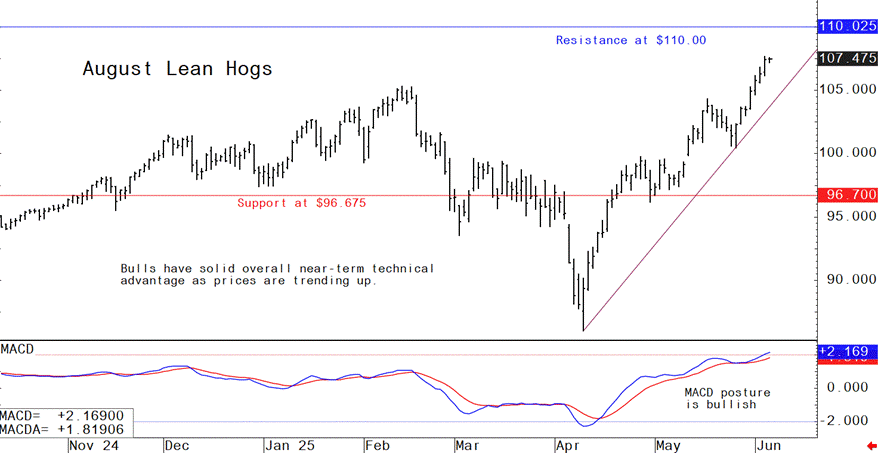 Livestock analyst Jim Wyckoff reports on global pig newsAugust lean hog futures prices this week hit a contract high and the bulls have the solid near-term technical advantage. The path of least resistance for prices remains sideways to higher. Cash hot and fresh pork market fundamentals remain solid. The latest CME lean hog index is up another 41 cents to $96.75 as of June 3. Hog futures traders anticipate the seasonal rally in prices will persist into late summer.