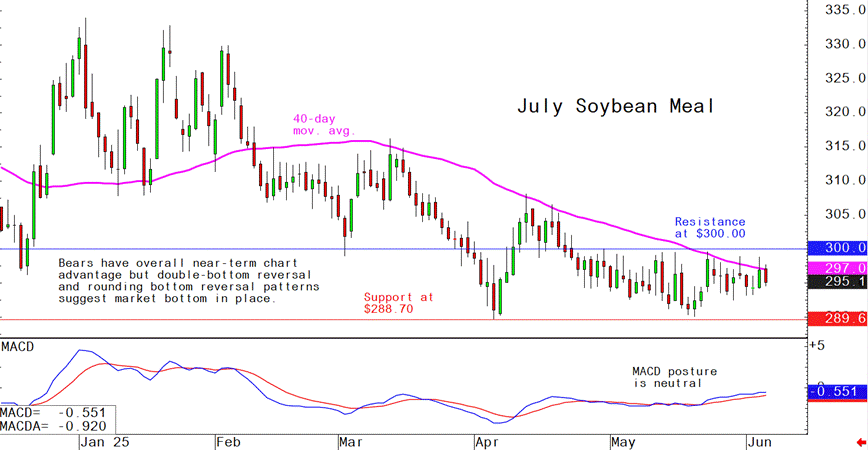 July soybean meal futures--$289.70 to $308.10, and with a sideways bias