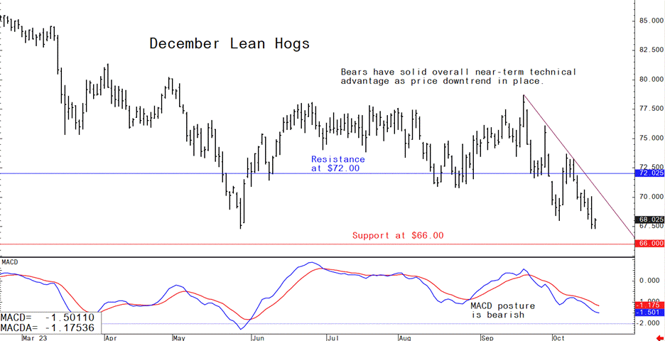 Livestock analyst Jim Wyckoff shares global pig newsThe lean hog futures bears have the solid near-term technical advantage as December hogs this week hit a new contract low and prices are trending lower on the daily bar chart. That suggests the path of least resistance for prices will remain sideways to lower for the near term. Wholesale pork prices continue to slip this week. The latest CME lean hog index fell 45 cents to $81.15 (as of Oct.16). Many futures traders continue to believe weakness in the cash hog market will continue in the coming weeks. Still-elevated cattle feedlot prices and still-high beef prices at the meat counter could soon put a floor under the hog and fresh pork markets, on better substitution demand from the consumer.