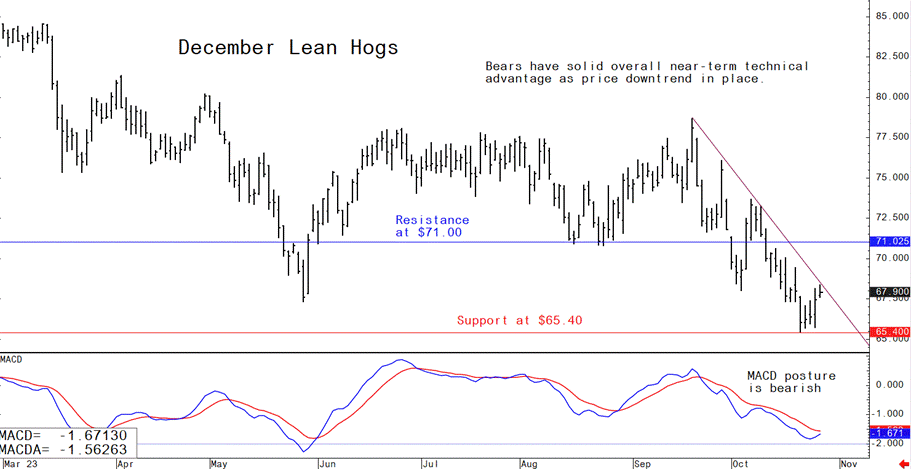Livestock analyst Jim Wyckoff shares pig news from around the globeThe lean hog futures bears continue to hold the solid near-term technical advantage as December hogs this week hit another new contract low and prices are in a five-week-old downtrend on the daily bar chart. That continues to suggest the path of least resistance for prices is sideways to lower for the near term. The latest CME lean hog index is down 26 cents at $78.41 (as of Oct. 24), extending the seasonal price decline. The recent sharp drop in live and feeder cattle futures prices has also emboldened the hog futures market bears. Lean hog futures bulls will have to produce multiple price closes above the $71.00 level in December futures to begin to suggest a market bottom is in place.