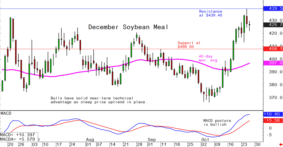 December soybean meal futures--$415.00 to $450.00, and with a sideways-higher bias