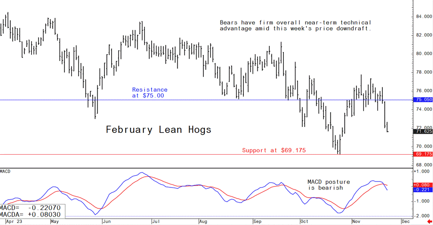 Analyst Jim Wyckoff shares pig news from around the worldFebruary lean hog futures Wednesday dropped to a three-week low and prices have careened lower this week, producing serious near-term technical damage to suggest more downside price pressure in the near term. Pork cutout value posted a new for-the-move low this week, marking the lowest value since early June. The CME lean hog index fell another 34 cents to $74.18, as of Nov. 20, a fresh seasonal low. Cash and wholesale fundamentals continue to weaken, which should continue to weigh on cash and futures prices in the near term. The lean hog market bulls can still point to generally good consumer demand for pork, amid historically elevated beef prices, which should keep a floor under present hog and pork price levels. Hog slaughter will likely rise as the industry gets back to work after the Thanksgiving holiday, with the weekly total probably reaching its annual peak during the week ending Dec. 16. However, wholesale ham demand is likely to be strongest in mid-December, ahead of the holidays.