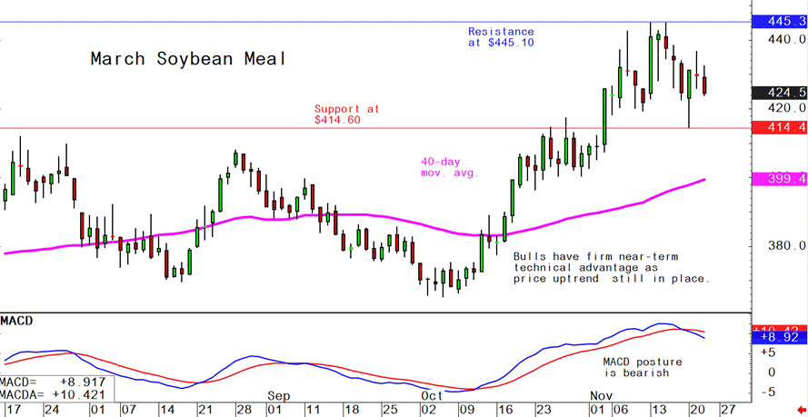 March soybean meal futures--$415.00 to $450.00, and with a sideways bias