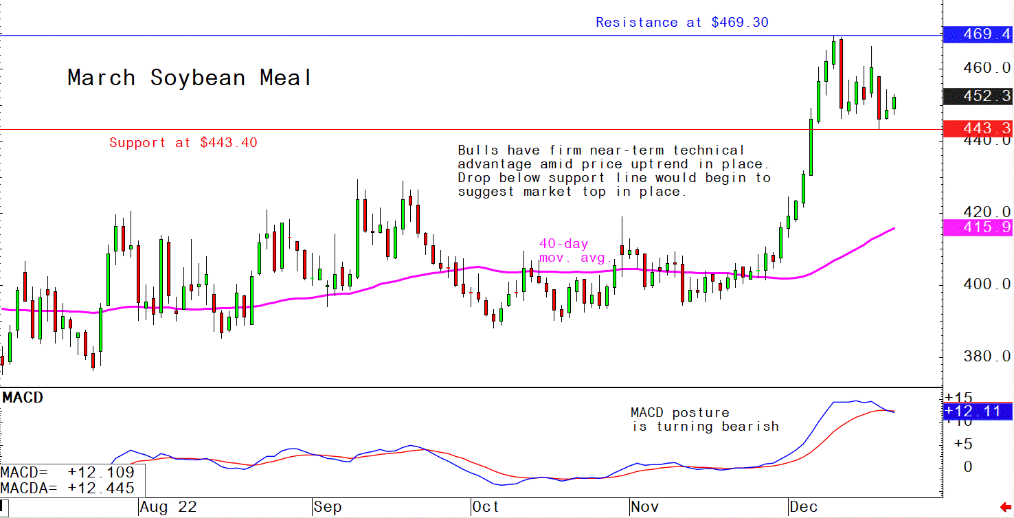 March soybean meal futures--$443.40 to $469.30, and with a sideways-higher bias