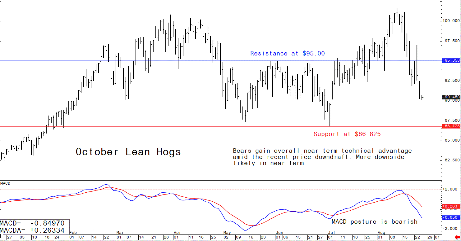 October lean hog futures--$86.825 to $95.00, and with a sideways-lower bias