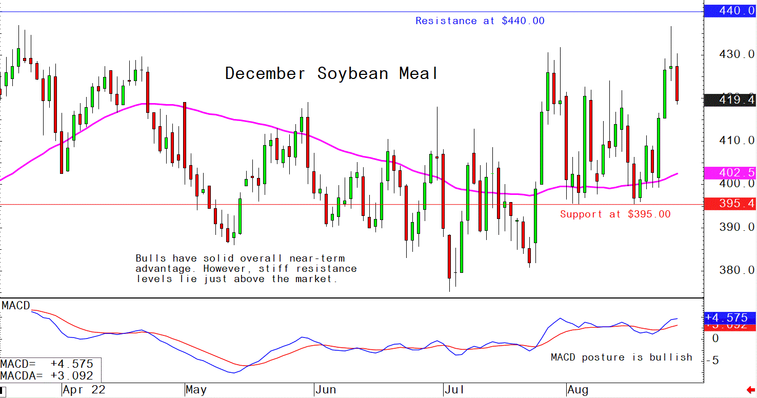 December soybean meal futures--$400.00 to $450.00, and with a sideways-higher bias